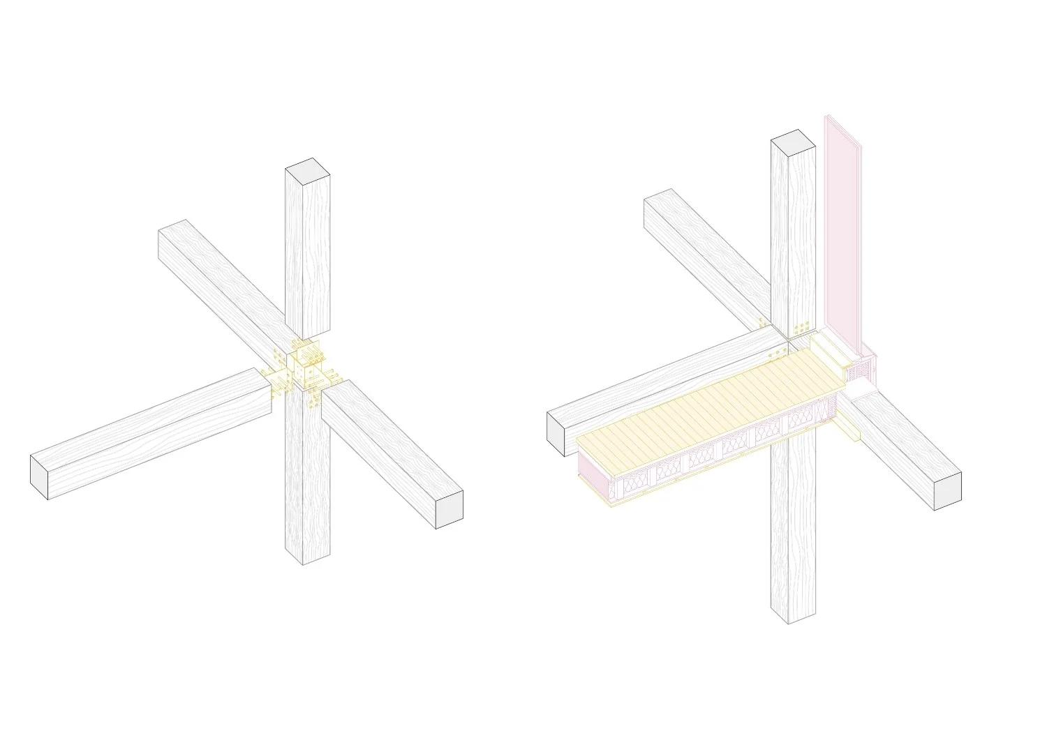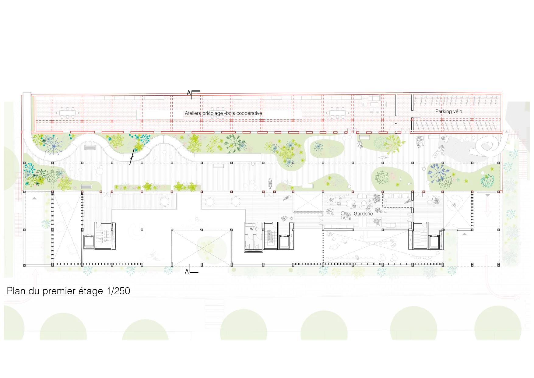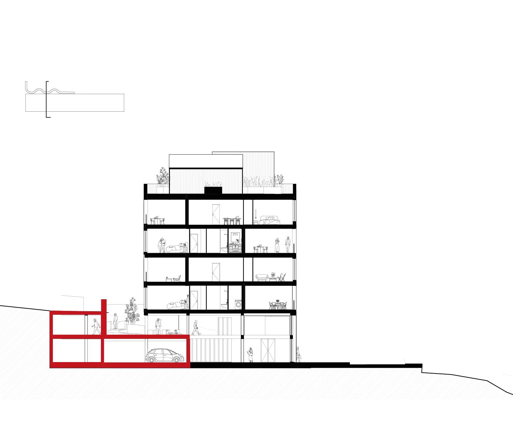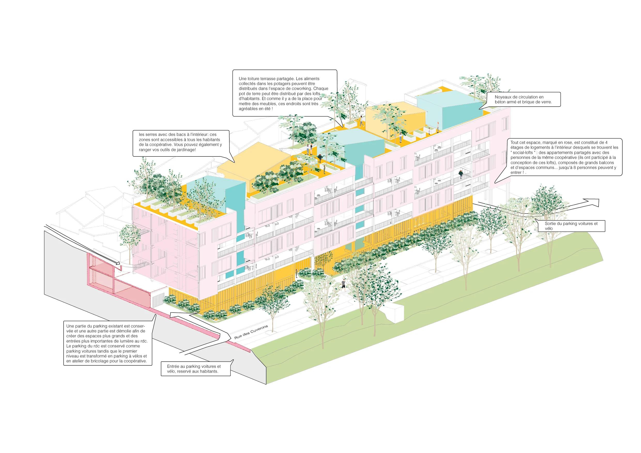 Le parking n'est pas démoli. Il est réinterprété. Une partie de la structure existante est conservée et transformée : le rez-de-chaussée reste accessible aux voitures, le premier niveau devient atelier de bricolage et parking vélos pour la coopérative. Ce qui était une infrastructure froide et monofonctionnelle devient le soubassement d'un projet de vie.