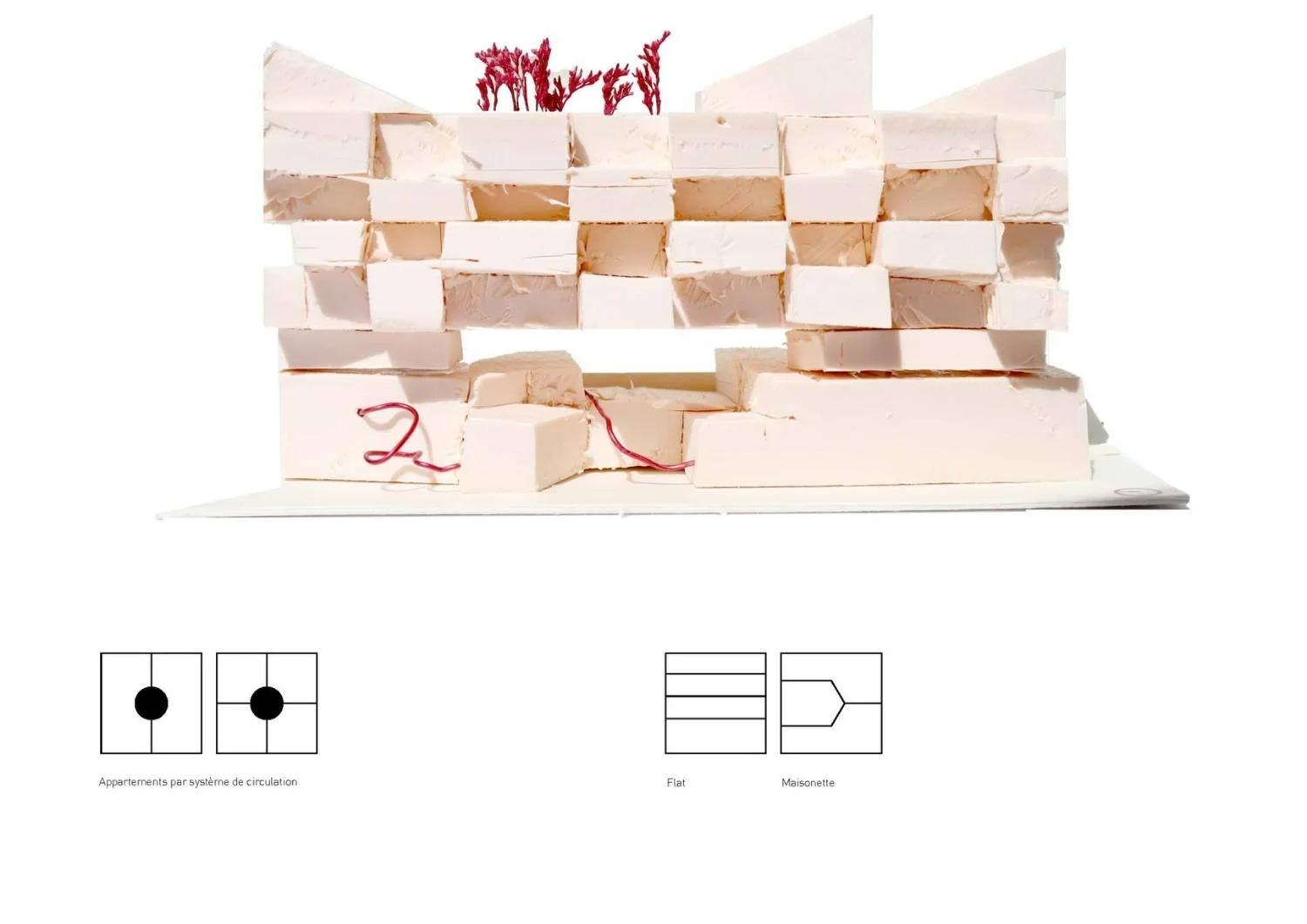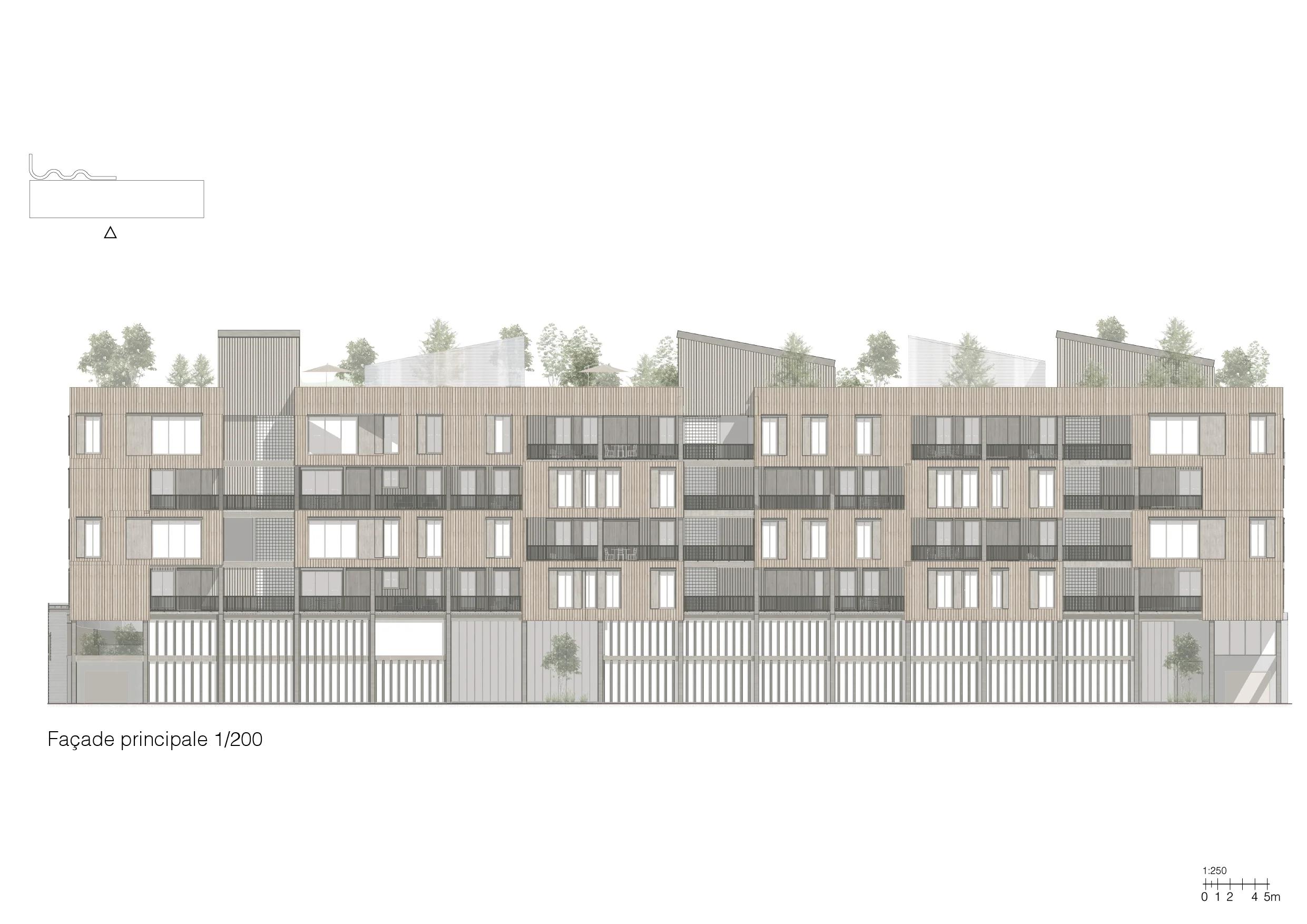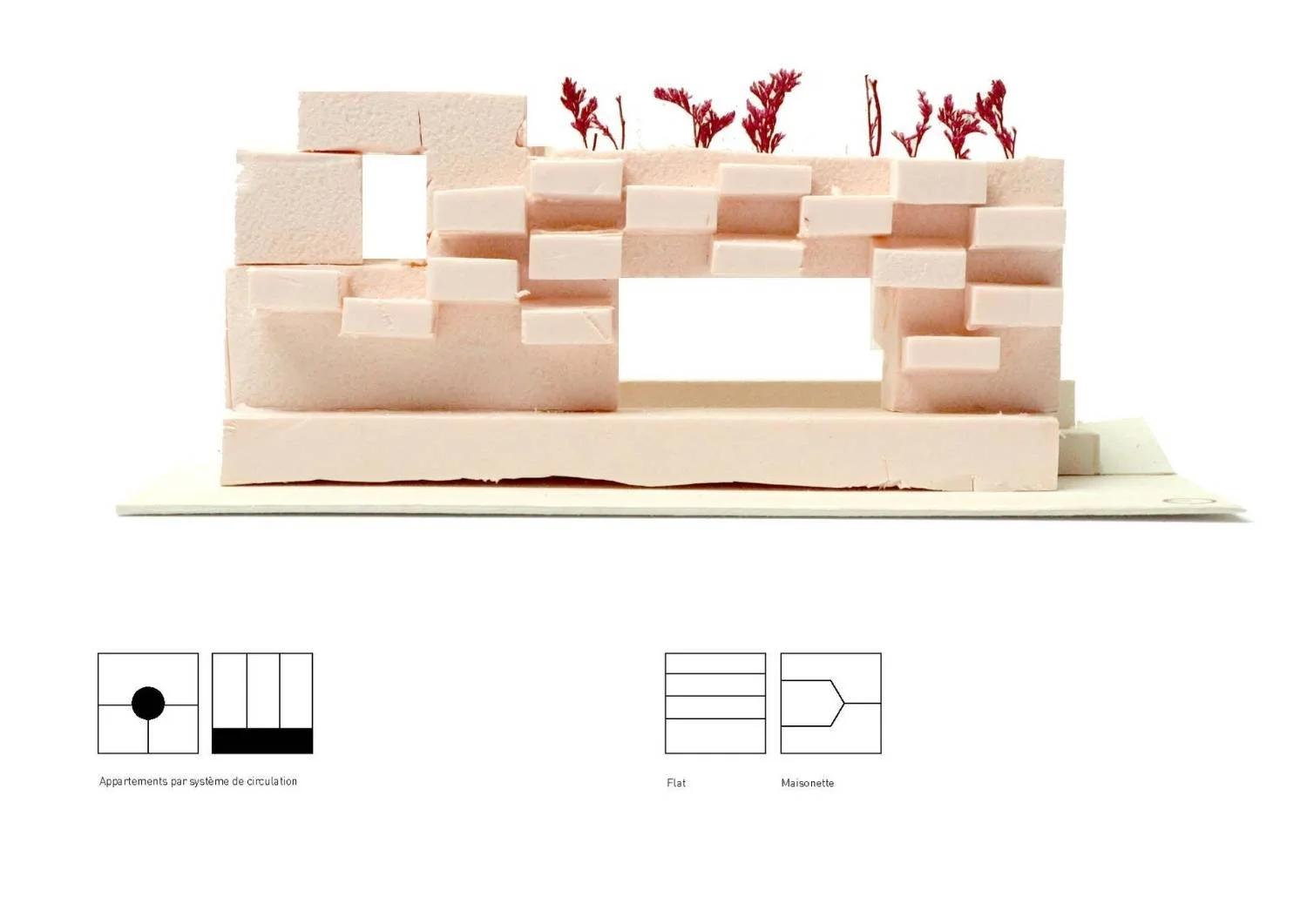 Le bâtiment absorbe la différence de niveau entre les deux routes en créant des jardins en plateformes des espaces horizontaux suspendus entre le haut et le bas, qui invitent à s'arrêter plutôt qu'à simplement passer. Ces plateformes végétalisées s'inscrivent dans la continuité de la topographie existante sans la forcer. La façade s'inspire du rythme architectural des bâtiments environnants leur échelle, leurs articulations, leur rapport au sol pour créer un anonymat paysager qui intègre le projet sans l'imposer. Le bâtiment ne cherche pas à se distinguer. Il cherche à appartenir. Et surtout, il s'ouvre. Les façades des niveaux inférieurs sont perméables des circulations publiques en rampe traversent le bâtiment de la route basse à la route haute, rendant le passage accessible à tous, y compris aux personnes à mobilité réduite. Le bâtiment n'est plus une barrière entre deux niveaux de la ville. Il est le chemin qui les relie.