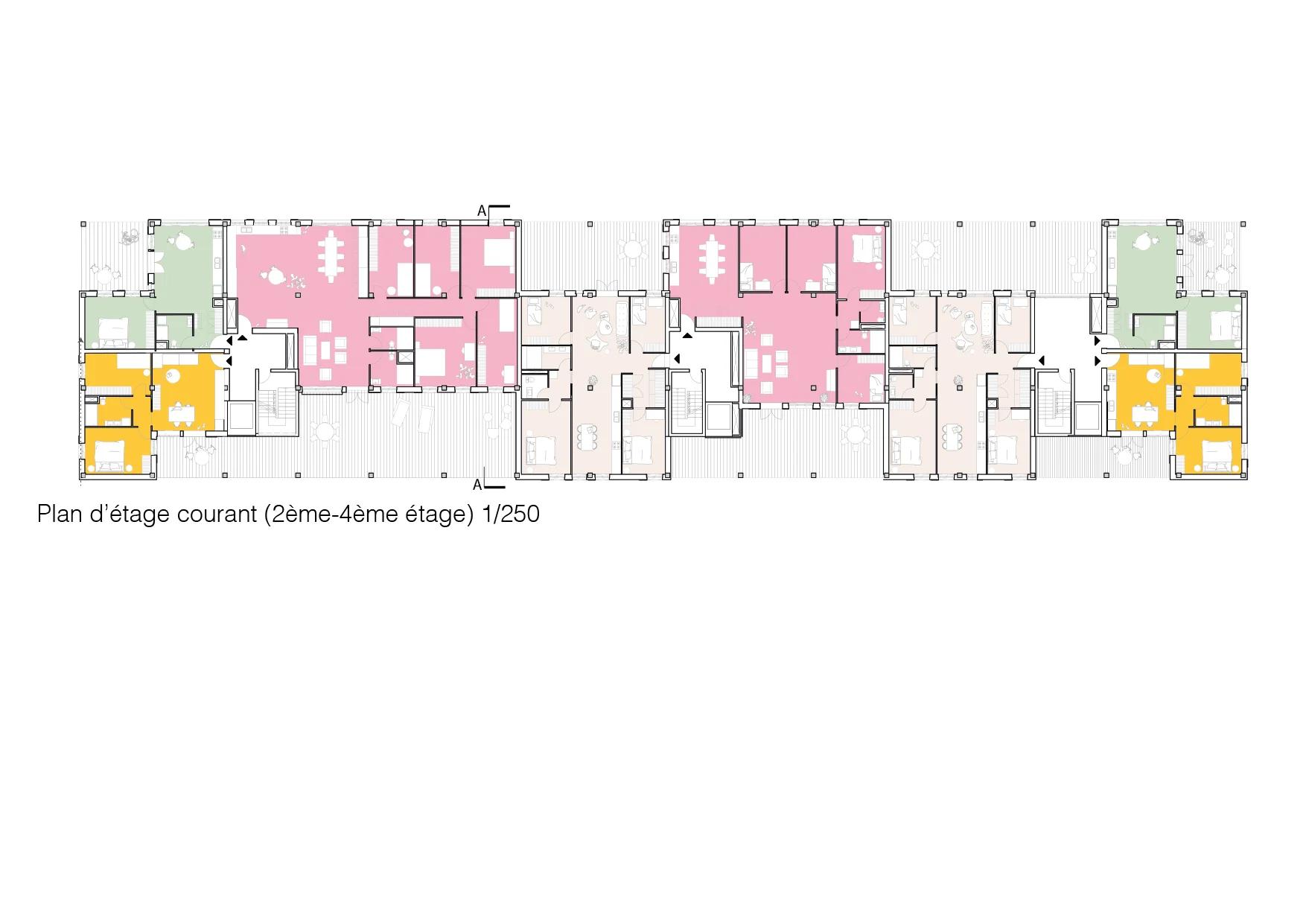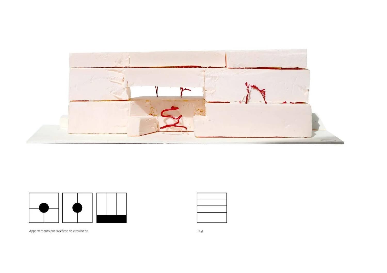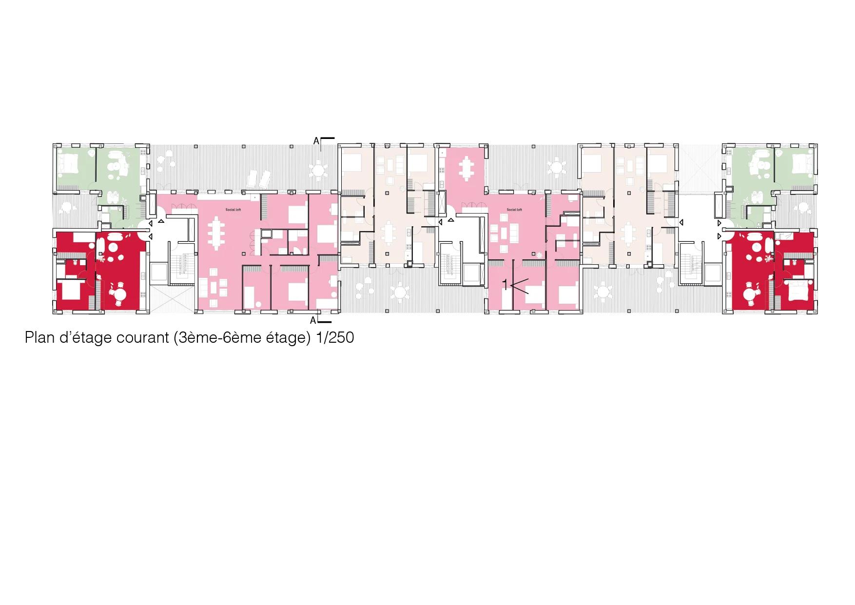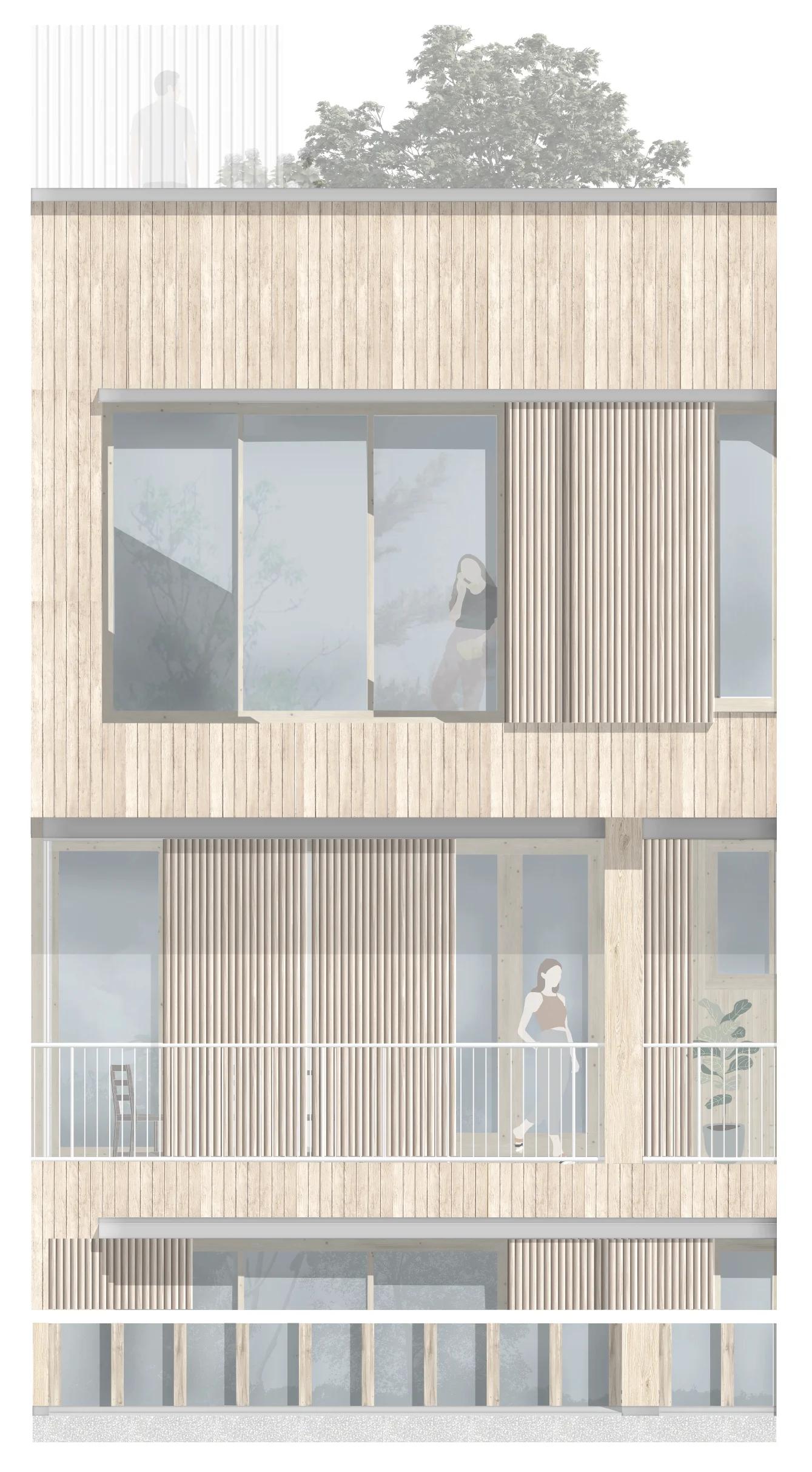 Quatre étages de social-lofts composent le programme résidentiel des appartements conçus avec et pour les habitants de la coopérative, jusqu'à 8 personnes par logement, avec de grands balcons et des espaces communs intégrés à chaque unité. Les noyaux de circulation en béton armé et brique de verre structurent le bâtiment tout en le rendant lumineux depuis l'intérieur. En toiture, des potagers collectifs partagés entre les résidents. Les serres avec bacs à l'intérieur sont accessibles à tous les membres de la coopérative. Ce qui est cultivé en haut redescend en bas : une épicerie au rez-de-chaussée distribue les produits récoltés, complétée par des espaces de restauration. Le cycle est complet , du sol à la table, dans le même bâtiment.